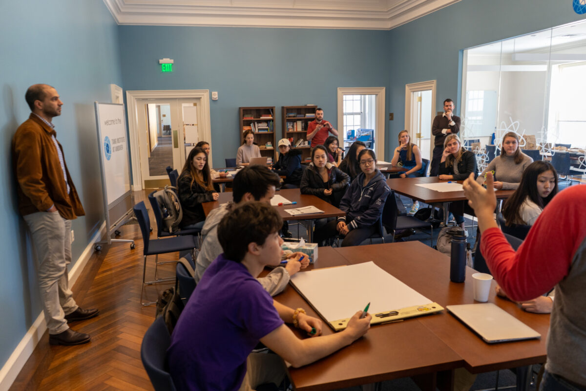 Members of the Workshop community gather in the Tang Institute for the first time.