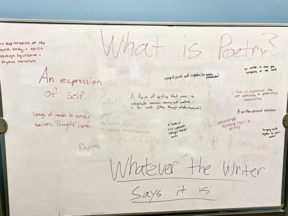 Students gave the usual answers: “an expression of self” and “a form of writing that aims to concentrate maximum meaning and emotion in a few words (often through metaphor, image, ect.).” As I have done hundreds of times, I asked if the group would be willing to know what I think poetry is. The group kindly solicited my opinion, and I wrote on the board “Poetry is whatever the writer says it is.” Of course, this frustrated some of the students. There were eye rolls and challenges of “what if someone thinks poetry is a duck?” Eventually, as often happens, an apt student pointed out “Perception is reality.”