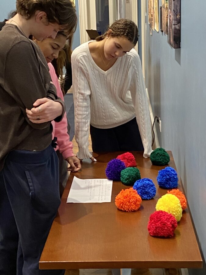 On Martin Luther King Day, I arrived early to the Tang gallery to set up ten different game stations that would illustrate how poetry can involve the body, is not limited to the page, and can be fun. I laid out metaphor dice, a box full of unique objects (PlayDoh, a clarinet’s barrel, a Russian doll, seashells, essential oils with aromatic smells, floss, a wind-up unicorn), a set of fuzzy colorful balls, an improv board game, and a card game titled “Vers: The Rap Game.” The latter, I thought, would meaningfully connect to Angie Thomas’s keynote address. Each station had directions or prompts, some that I made up, others that I learned from master poetry teachers like Marty Skoble from the Saint Ann’s School. Students looked around slightly puzzled at first, but quickly settled into seats. We introduced ourselves, and I asked the group, “What is poetry?”